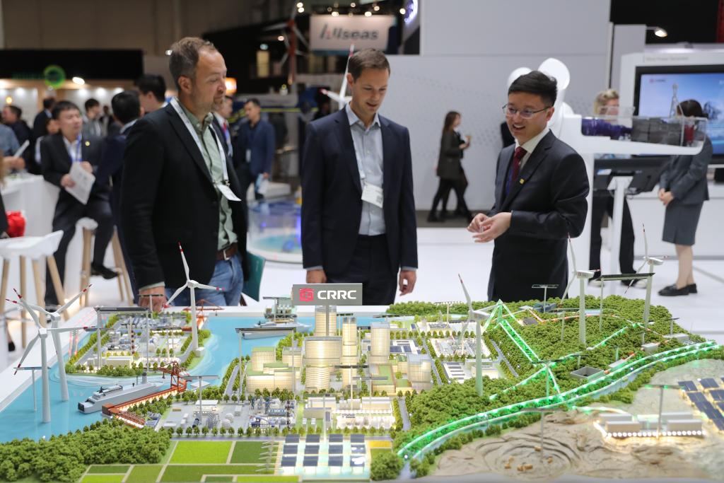 9月24日,在德国汉堡国际风能展中国中车展区,工作人员为参观者讲解沙盘模型。新华社记者杜哲宇摄