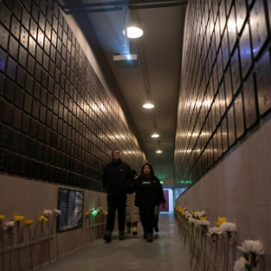 在731部队本部旧址中心走廊一楼,3000块长方形黑色石碑整齐陈列于墙体两侧,形成一条庄严肃穆的长廊。往来工作人员、参观者、志愿者纷纷献上菊花、沉思缅怀。