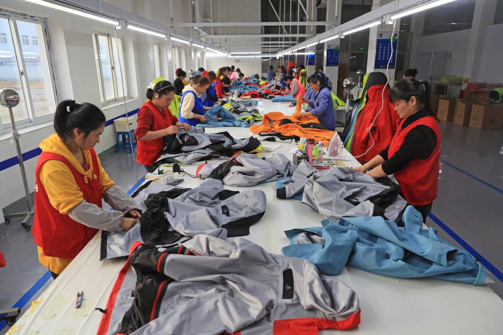 11月15日,在辽宁飞马特实业有限公司,工作人员在对冲锋衣进行出厂检查。(新华社记者 杨青 摄)