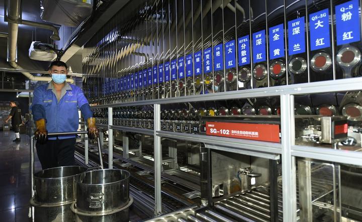 2023年10月17日,浙江鸿大印染集团有限公司的工作人员在染料全自动称料车间工作。新华社记者翁忻旸摄