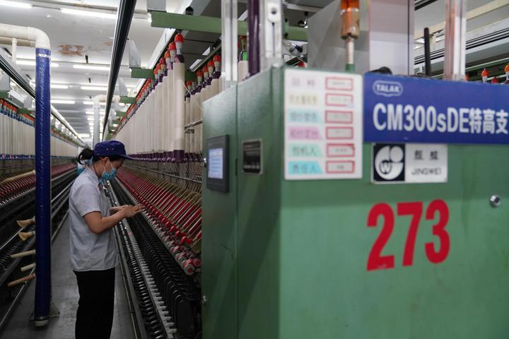 2023年5月8日,在无锡一棉纺织集团长江车间,工人在特高支纱生产线上作业。该生产线可批量生产达到世界领先水平的300支纯棉纱线。新华社记者马宁摄