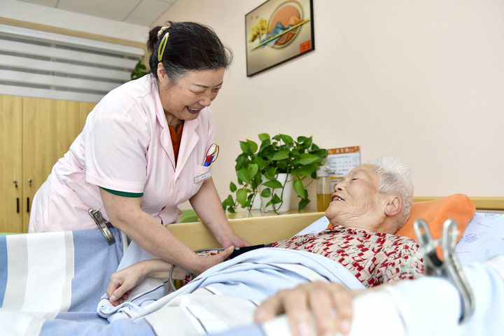 在山东省日照市东港区石臼街道津海社区养老服务中心,工作人员照料失能老人。新华社记者 郭绪雷 摄