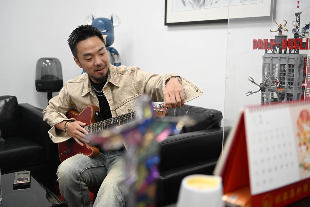 12月13日,邱志晖在珠海的办公室内调试吉他。新华社记者 邓华 摄