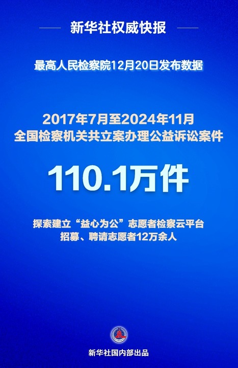 2017年7月至2024年11月,全国检察机关共立案办理公益诉讼案件110.1万件;向行政机关提出检察建议近79万件,回复整改率达98.8%……
