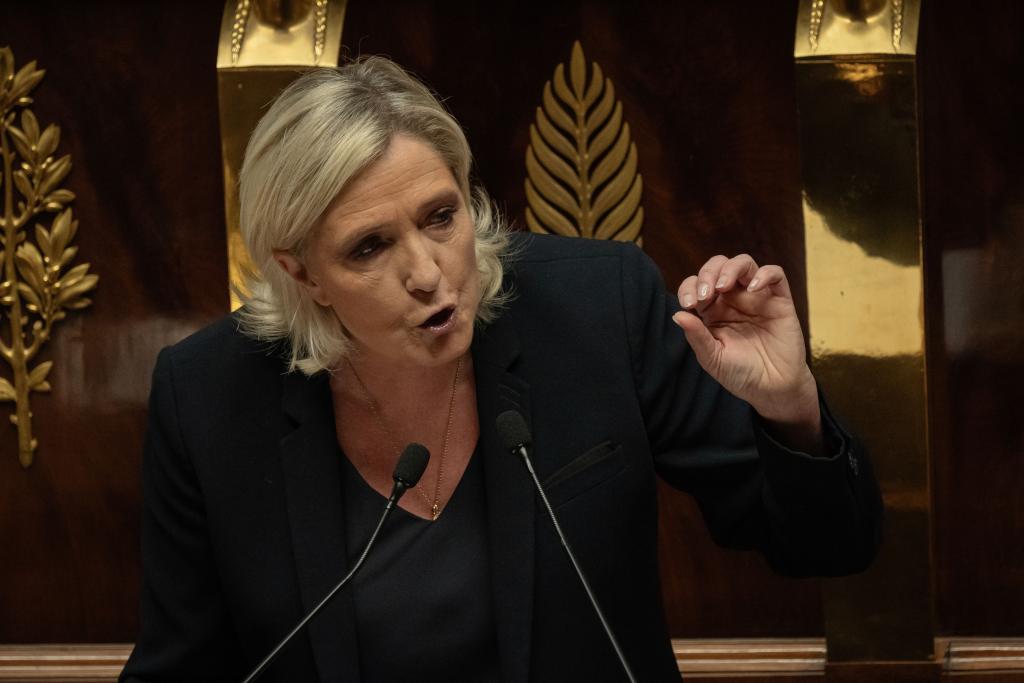 12月4日,在位于法国巴黎的国民议会,法国极右翼“国民联盟”国民议会党团主席玛丽娜·勒庞参加两项针对政府的不信任动议进行投票表决前的辩论。 新华社发(奥雷利安 莫里萨尔摄)