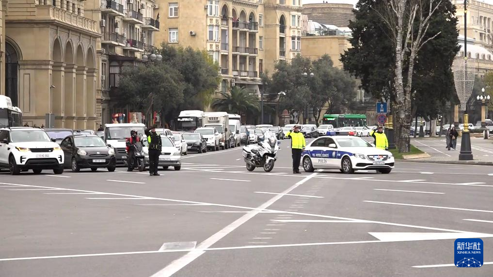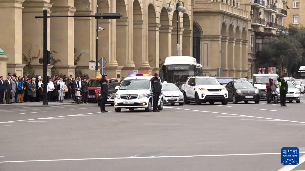 12月26日中午12时,在阿塞拜疆首都巴库,车辆停止行驶,为阿塞拜疆飞机失事遇难者默哀(视频截图)。新华社发(胡姆贝特·马马多夫摄)