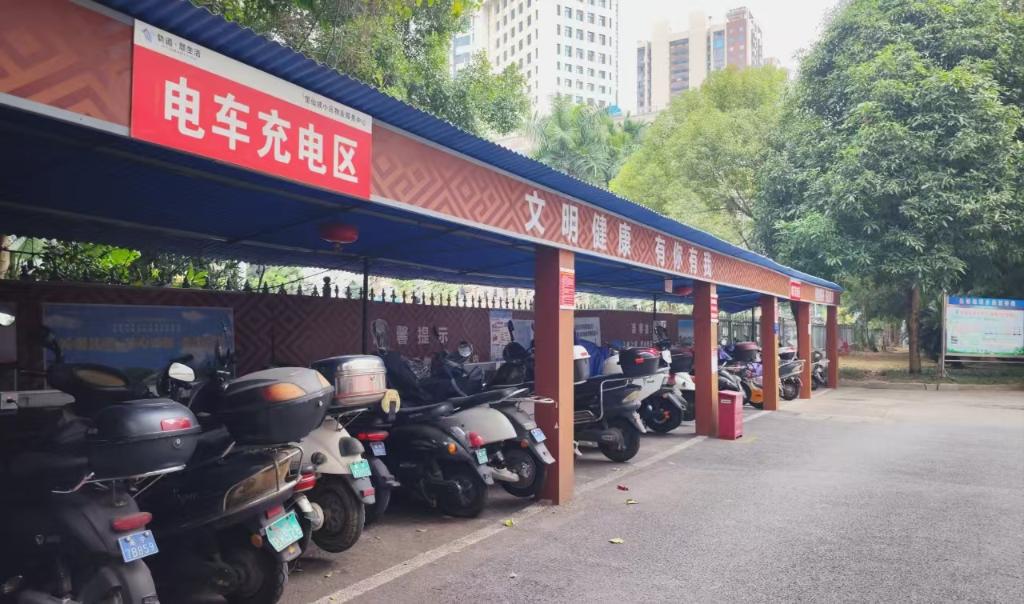 在南宁市兴宁区中房望仙坡小区,改造后的电动自行车集中停放区安装了挡雨棚和扫码充电口。 新华社记者 杨驰 摄