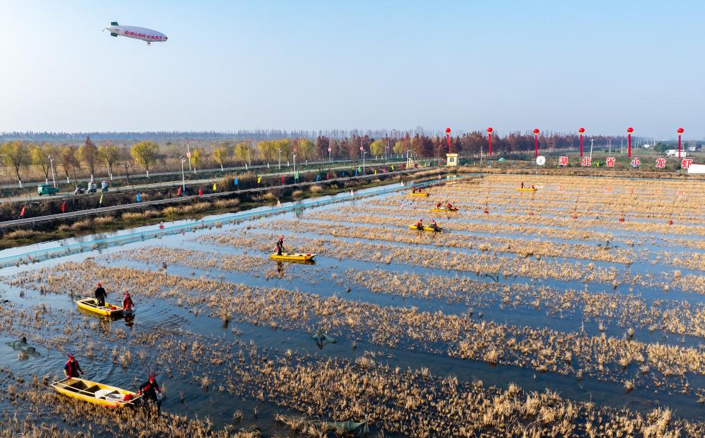 12月28日,虾农在湖北潜江后湖虾稻共作立体模式试验示范基地捕捞小龙虾(无人机照片)。新华社记者 胡竞文 摄