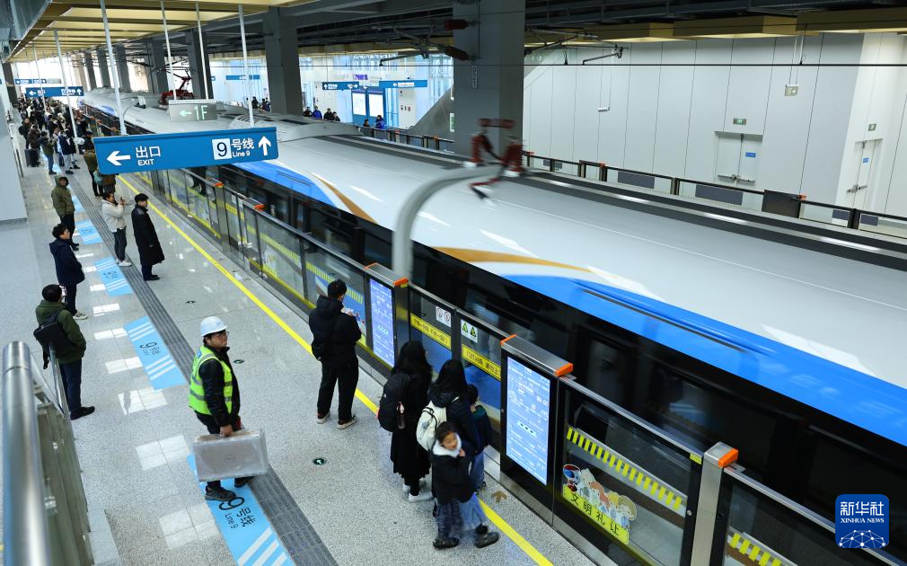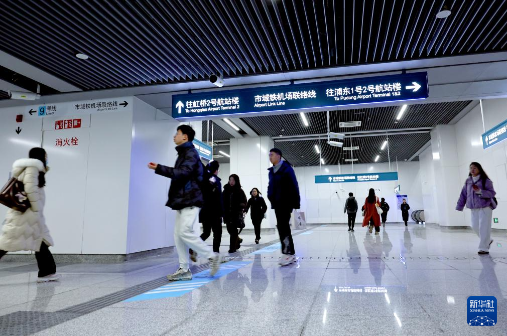 12月27日,乘客走在地铁9号线与市域机场线换乘通道内。