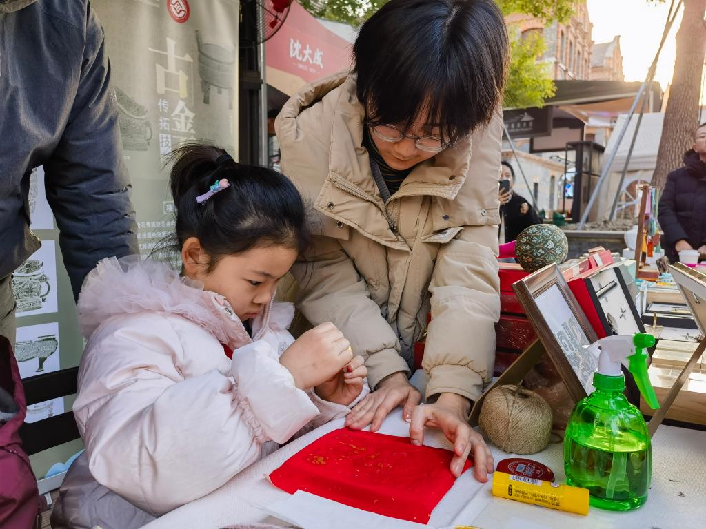 在上海市虹口区“今潮8弄”举办的跨年非遗市集,7岁的金辰怡跟着上海博物馆的专家体验金石传拓:在刻有纹饰和铭文的石板上铺上湿润的宣纸,用工具蘸墨扑打,将石刻表面的纹饰和铭文真实拓印下来。“要把石板上高高低低的纹饰细节拓下来,墨还得匀,这真是又细致又费劲的工作。”金辰怡拓了一幅有两只小鹿在松树下的“路路平安”图,表达对2025年的祝福。
