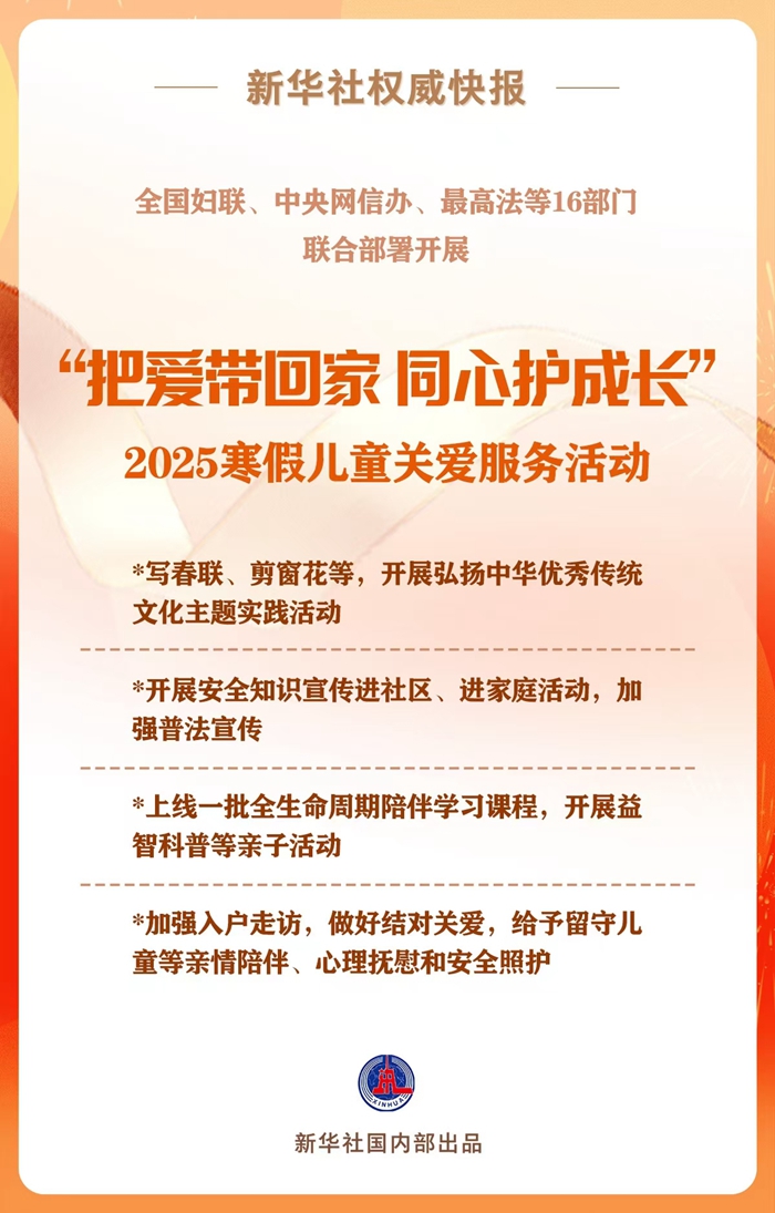新华社北京1月6日电(记者黄玥)全国妇联、中央网信办、最高人民法院、最高人民检察院、教育部、公安部等16部门印发通知,联合部署开展“把爱带回家 同心护成长”2025寒假儿童关爱服务活动,帮助广大儿童度过一个健康、安全、快乐、有意义的假期。