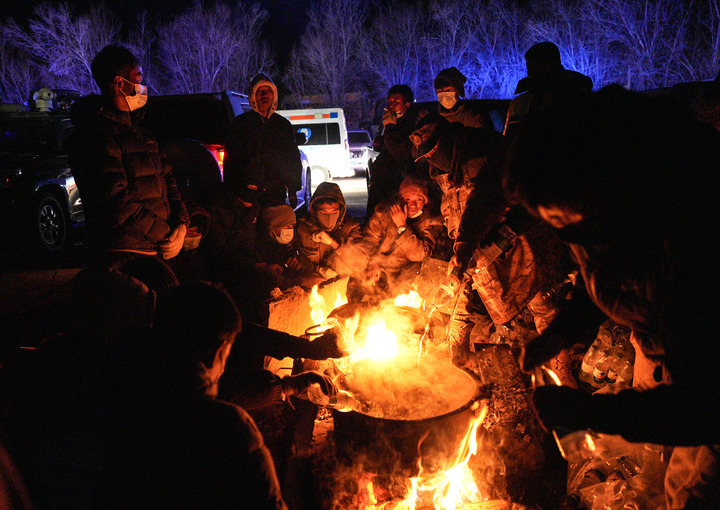 1月7日晚,安置点的受灾群众在煮水准备泡方便面。新华社记者 晋美多吉 摄