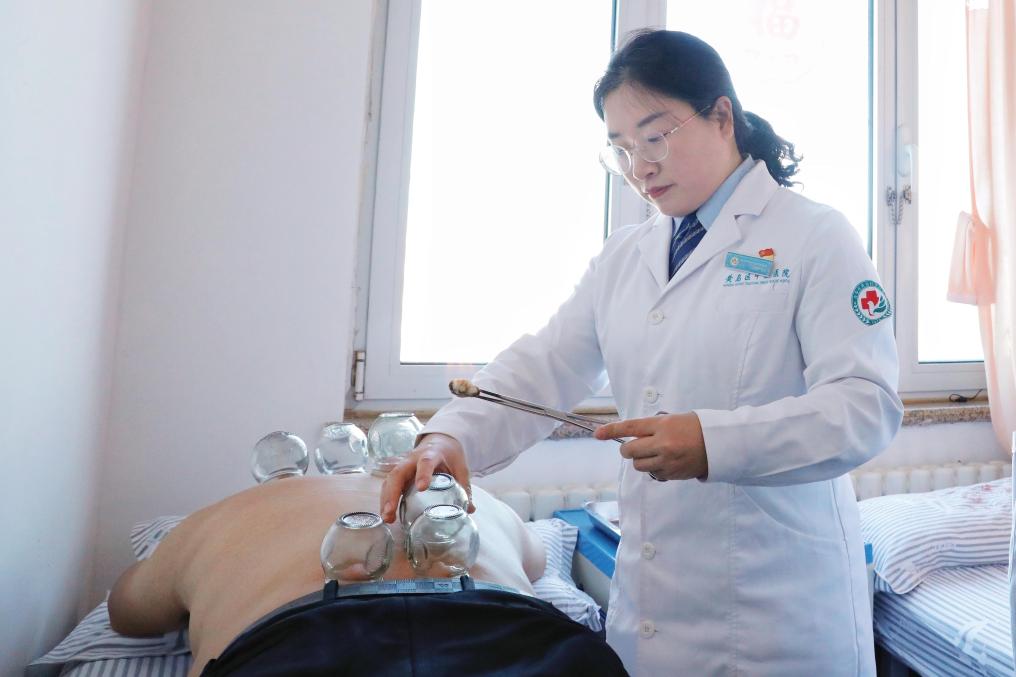 青岛西海岸新区中医医院康复科主治医师为患者进行拔罐治疗。(受访者供图)