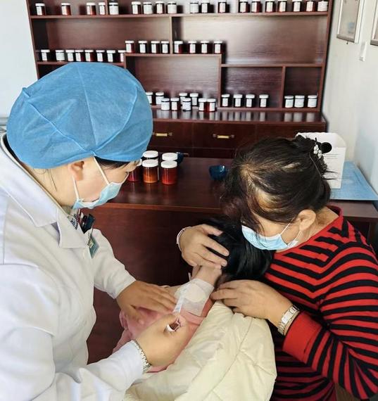 在青海省西宁市南川东路社区卫生服务中心,中医儿科医师为居民贴“三九贴”。(受访者供图)