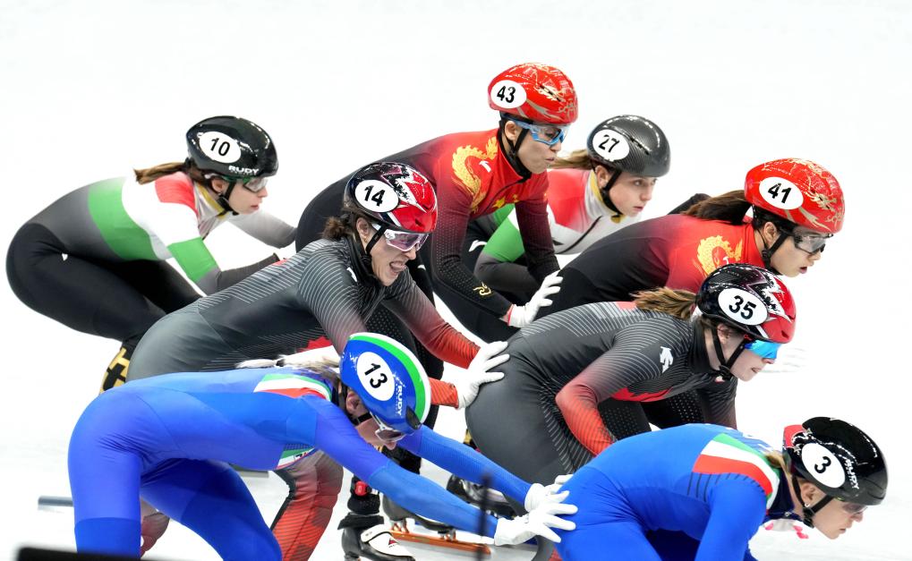 2022年2月5日,中国选手范可新(上左二)与队友曲春雨(上右一)在北京2022年冬奥会短道速滑混合团体接力决赛中。新华社记者 陈建力 摄