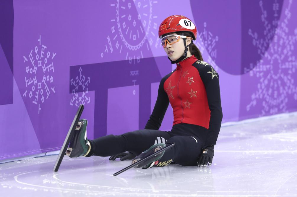 2018年2月13日 ,中国选手曲春雨在平昌冬奥会短道速滑女子500米半决赛中摔倒后滑到场边。她被判犯规无缘决赛。新华社记者 韩岩 摄