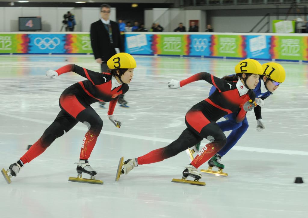 2012年1月19日,曲春雨(左二)在2012年冬青奥会短道速滑女子500米决赛中。新华社记者 徐亮 摄
