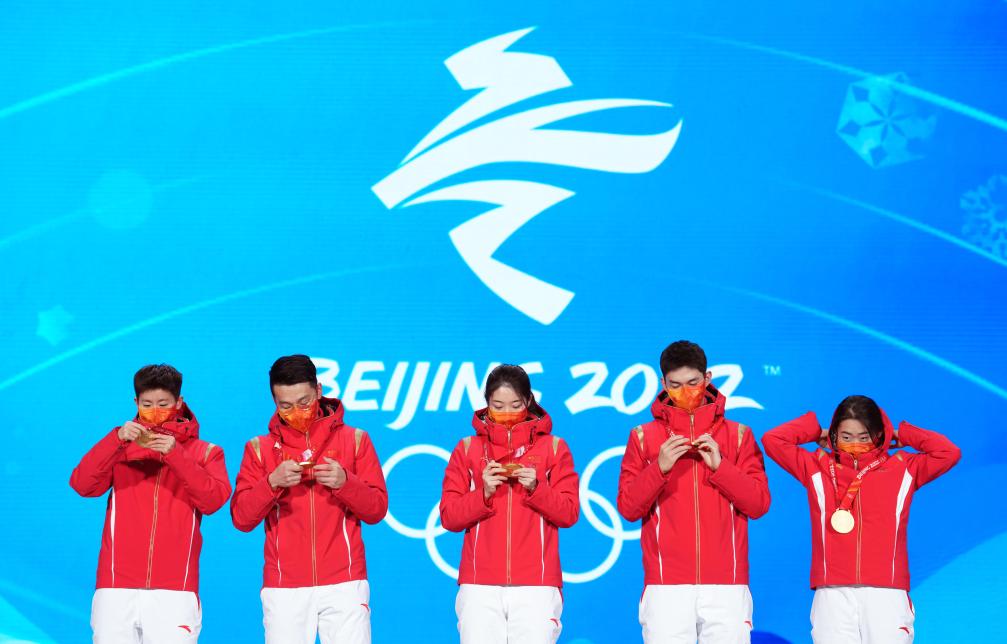 2022年2月6日,范可新、任子威、曲春雨、武大靖、张雨婷(从左至右)在北京2022年冬奥会短道速滑混合团体接力奖牌颁发仪式上。新华社记者 鞠焕宗 摄