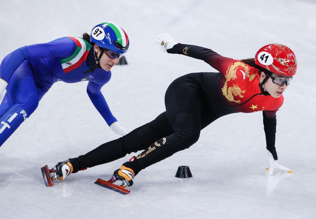 2022年2月5日,曲春雨(右)在北京2022年冬奥会短道速滑混合团体接力四分之一决赛中。新华社记者 杨磊 摄