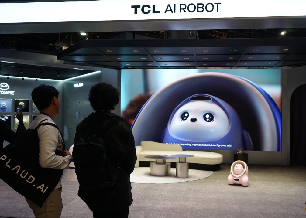 1月8日,在美国拉斯维加斯消费电子展上,人们在TCL展区观看分体式AI陪伴机器人TCL Ai Me。