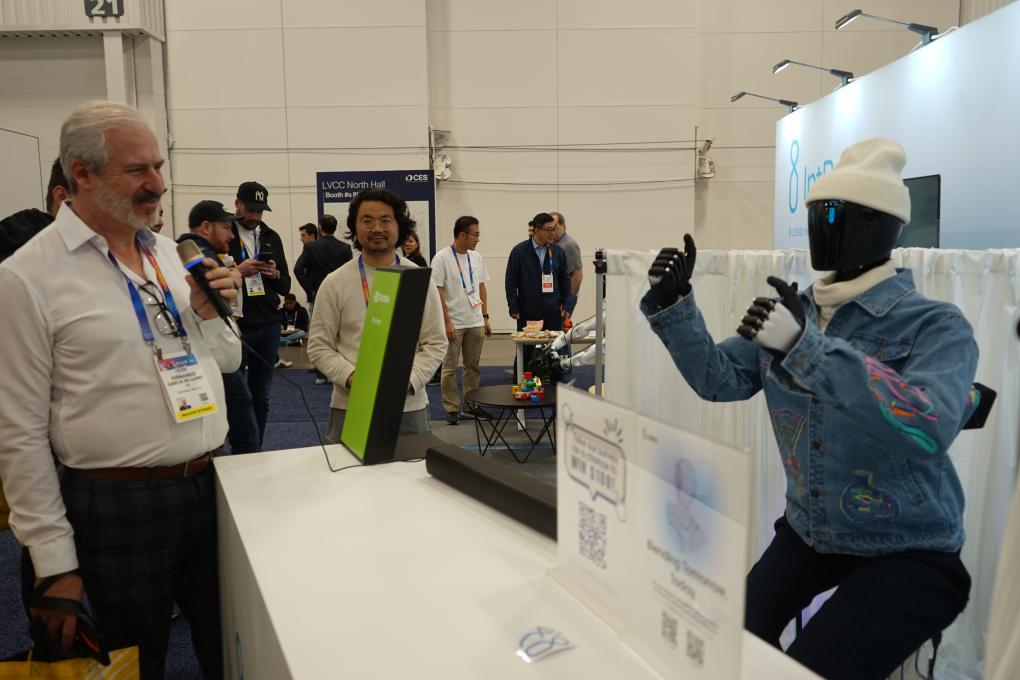 1月8日,在美国拉斯维加斯消费电子展上,人们在IntBot展区观看机器人展示。