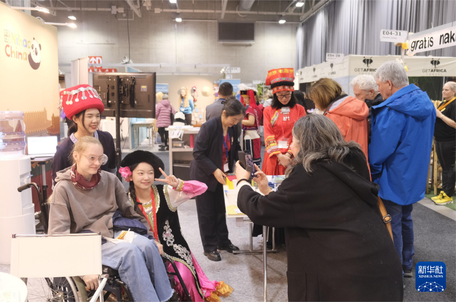 1月10日,在挪威利勒斯特伦举行的挪威旅游展上,参展者与“你好!中国”展台的工作人员合影。新华社记者 张玉亮 摄