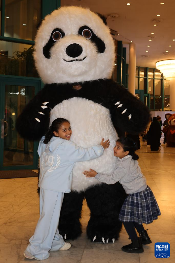 1月11日,在沙特阿拉伯首都利雅得文化宫举行的“新春大集”活动上,孩子们与大熊猫人偶合影互动。新华社记者 王海洲 摄
