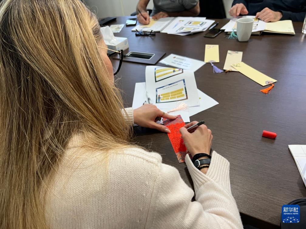 课堂上,王维丽提问,中国春节即将来临,按照中国生肖,2025年是什么年?大家不约而同地用中文大声回答:“蛇年”。为了给春节送上祝福,大家各自在配有中国结、以中国红为主色调的书签上一笔一画地写下“大吉大利”四个汉字,为自己制作别具一格的书签。