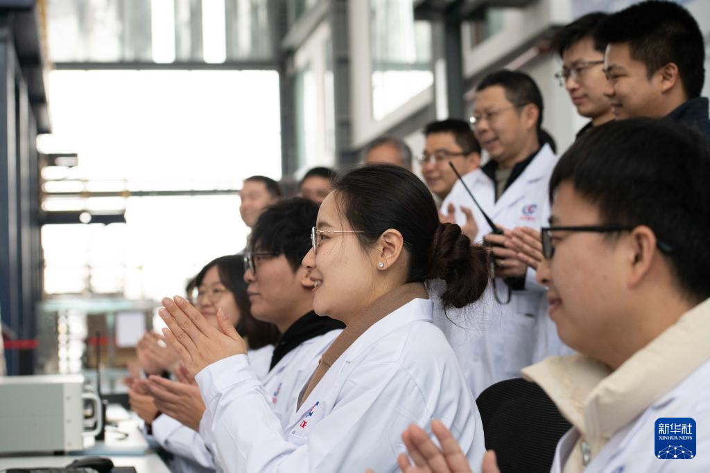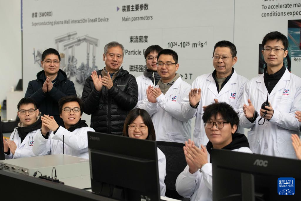 1月14日,经专家组鉴定,“赤霄”参数达到设计指标,科研人员在强流直线等离子体装置“赤霄”前庆祝。新华社记者 张端 摄