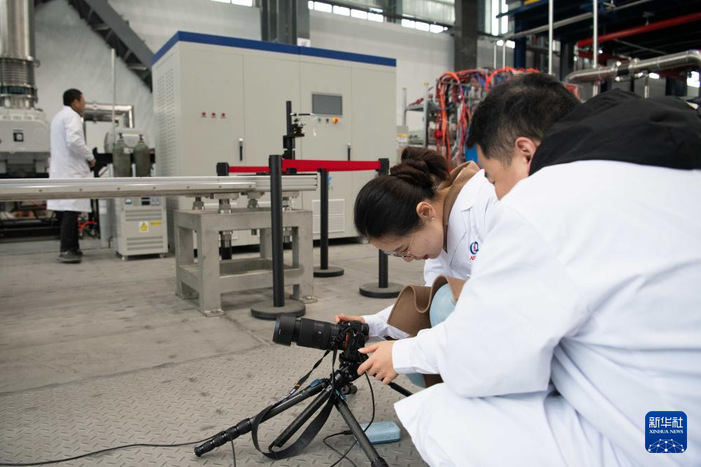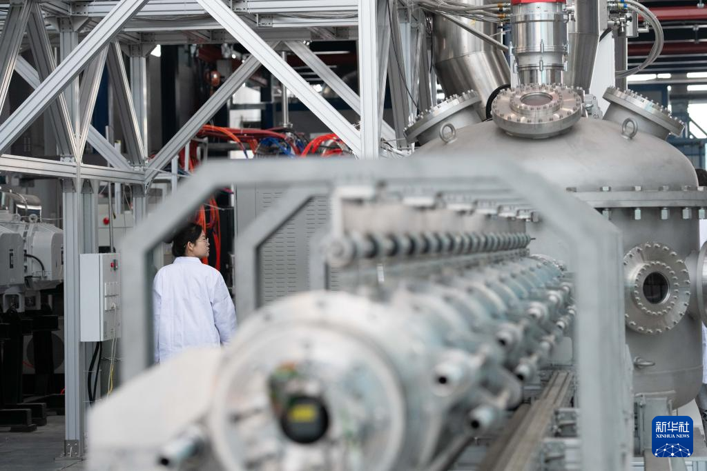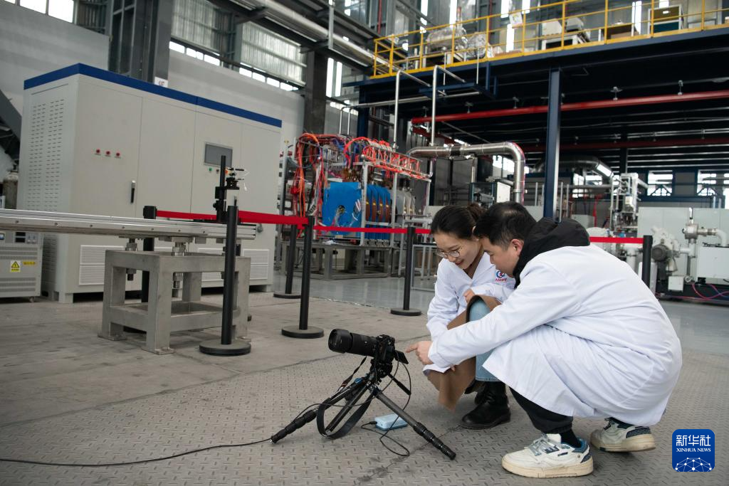 1月14日,在位于安徽省合肥市的聚变堆主机关键系统综合研究设施(CRAFT)园区内,科研人员在巡看强流直线等离子体装置“赤霄”的运行状态。新华社记者 张端 摄