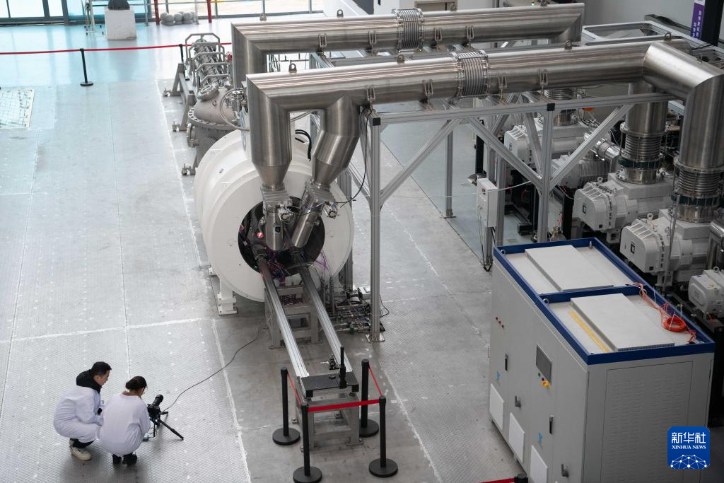 1月14日,在位于安徽省合肥市的聚变堆主机关键系统综合研究设施(CRAFT)园区内,科研人员在强流直线等离子体装置“赤霄”前进行交流。新华社记者 张端 摄