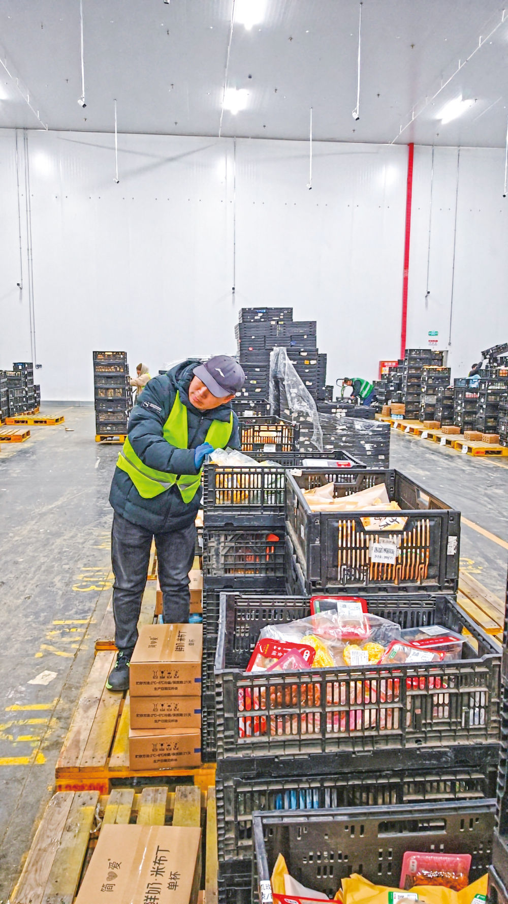 晚9点,记者来到东六环外一处大型物流仓库,数千平方米的空间里,牛奶、蔬菜、水果、面包、熟食、零食等各自堆成小山。这处物流集散地24小时连轴转,进京货物先运至此,分拣后再发往各地。