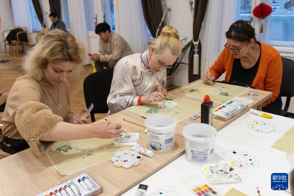 1月17日,在匈牙利布达佩斯,人们在“指尖上的非遗——中国文化体验日”为主题的2025“欢乐春节”活动上体验中国绘画。新华社发(弗尔季·奥蒂洛摄)
