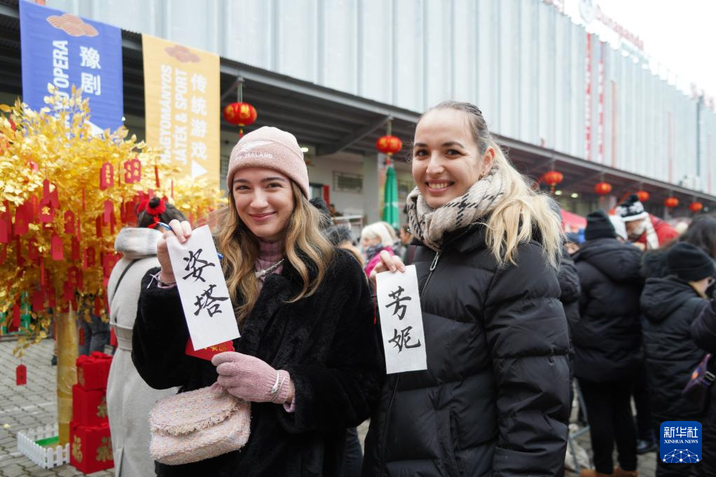 1月18日,两名女子在匈牙利首都布达佩斯举行的新春庙会活动上展示自己的中文名字。新华社记者 陈浩 摄