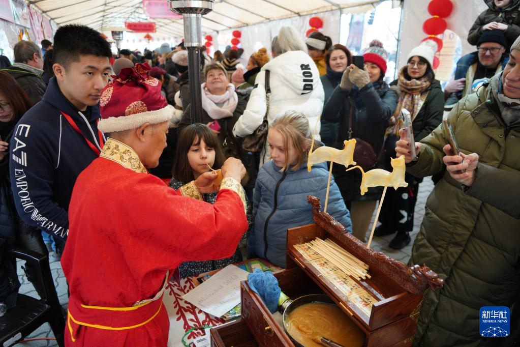 1月18日,一名女孩在匈牙利首都布达佩斯举行的新春庙会活动上体验吹糖人。新华社记者 陈浩 摄