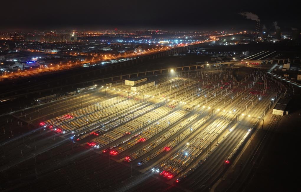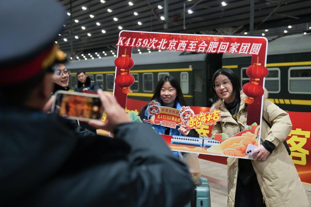 2025年1月13日23点25分,在北京西站,乘坐北京地区春运首趟旅客列车K4159次列车的旅客在车厢外合影。新华社记者 鞠焕宗 摄