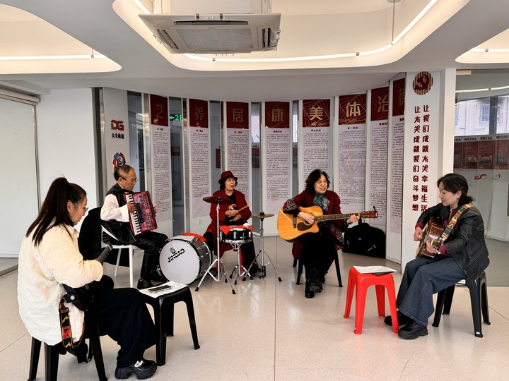 场地不仅有音响、灯光、音乐控制台等设备,也为老年群体提供了一个交流的场所。大关街道党群服务中心的工作人员告诉记者,作为老旧小区集聚区,如何安顿好老年群体的退休生活,让他们能老有所乐,一直是当地街道、社区工作的重点内容。董云蓉奶奶和她的乐队感染、鼓舞、带动了很多周边的老年居民走出家门,发挥余热。现在这里已经吸引、孵化了64个本土社团和40位民间达人,极大丰富了周边群众的休闲娱乐,也成了周边老年人的第二个“家”。