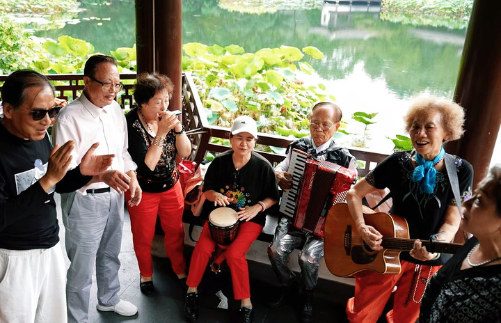 几年前,从事地质工作退休的杭州阿姨龚沙金在电视上看《星光大道》时,发现了这支家门口的“宝藏”乐队,四处打听加入其中的方式。董云蓉知道后很欢迎:“喜欢吉他你就来!”