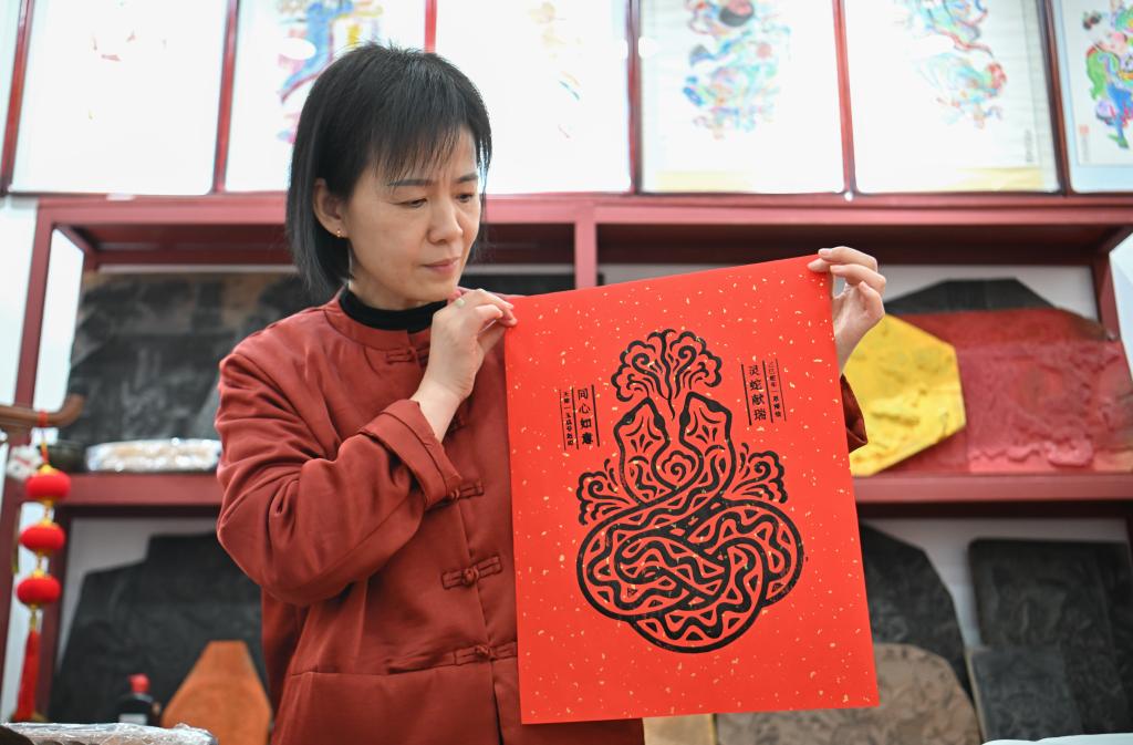 深入画坊内部,三幅“蛇”元素的新颖年画吸人眼球。两蛇盘绕成心形,向上托起祥云,寓意灵蛇献瑞、同心如意;花蛇逆时针绕在圆盘四周,寓意“蛇”来运转,金银满钵;融入动漫国潮元素的“卡通”年画,受到年轻人喜爱……张宏尝试将年画元素与现代文创相结合,“得让年画从墙上‘走下来’,吸引更多人的目光。”张宏说。