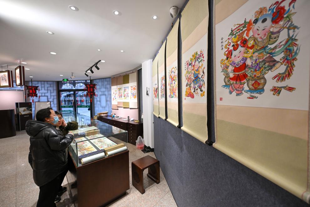 海河之畔,热闹喧嚷的古文化街上,黑漆金字的木制牌匾“杨柳青画店”引人注目。为迎接蛇年春节,店铺改造一新,不少顾客正精心挑选着蛇年生肖主题年画。一旁的数字屏内收录了几百种年画,搭配现代家居生活场景,给予顾客选购年画更多灵感。