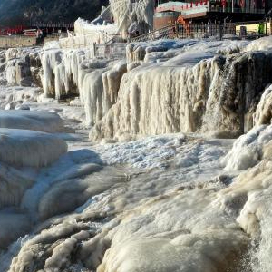 冬日的黄河壶口瀑布在冰雪的覆盖下更显别样壮美。(吕桂明 摄)