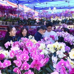 明媚橘、浓郁紫、薄荷绿、波尔多红、克莱因蓝……素有“兰花皇后”之称的蝴蝶兰,整齐地摆放在花架上,扇形花瓣上刻着细腻的纹路,如成群的蝴蝶栖息在花枝上,占据了年宵花市绝对的“C位”。作为香港年味的“气氛组”,一簇簇象征新春吉祥如意的百合、银柳、水仙、剑兰等,静待“有缘人”将它们带回家。
