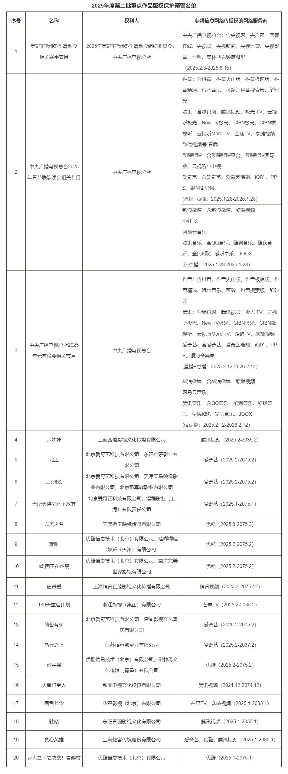 为加大重点作品版权保护力度,国家版权局近日发布2025年度第二批重点作品版权保护预警名单,《六姊妹》《北上》《驻站》《国色芳华》等17部电视剧网络剧以及第9届亚洲冬季运动会相关赛事节目、中央广播电视总台2025年春节联欢晚会相关节目和元宵晚会相关节目上榜。