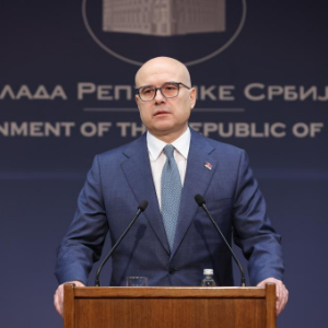 1月28日,在塞尔维亚首都贝尔格莱德,塞尔维亚总理武切维奇在塞尔维亚政府大楼举行的新闻发布会上宣布辞职。新华社发(普雷德拉格·米洛萨夫列维奇摄)