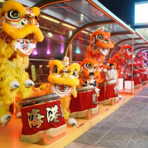 维多利亚港畔,一连串摆起18只色彩鲜艳的醒狮,带来缤纷的祝福:飞“黄”腾达、一炮而“红”、平步“青”云……
