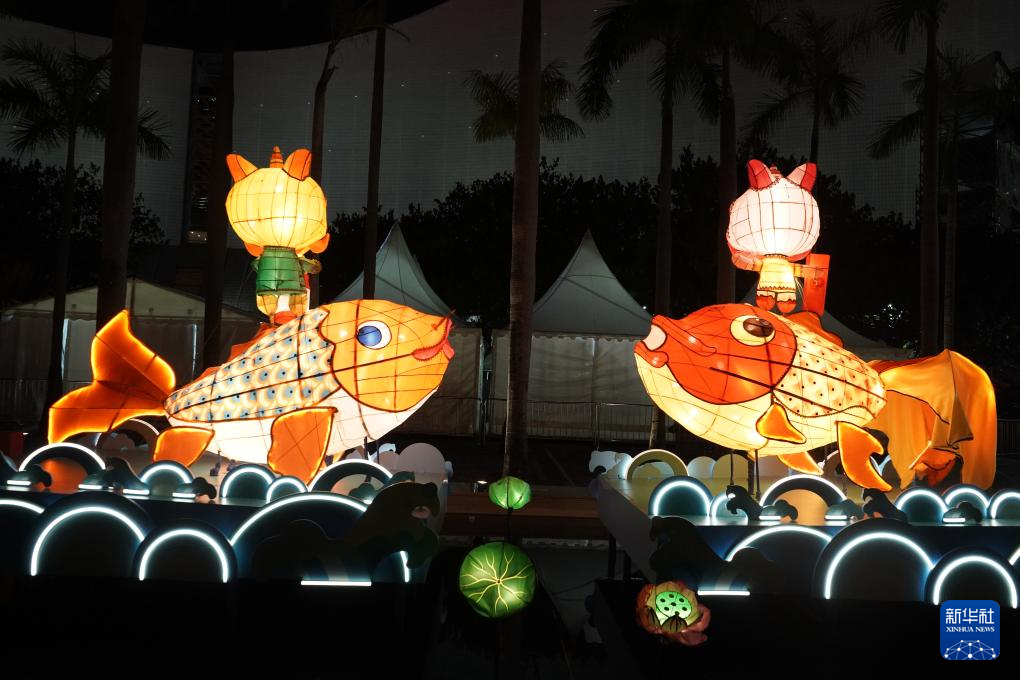 香港文化中心露天广场上,一组由香港非物质文化遗产办事处策划的扎作彩灯与四周景色相映成趣,锦鲤与金鱼在水池上跃动,小醒狮站在鱼背上嬉戏。