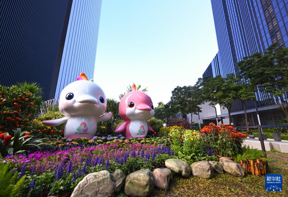 在金钟,2米多高的第十五届全国运动会吉祥物“喜洋洋”“乐融融”从除夕开始现身添马公园,与大家共贺新春,喜迎全运。