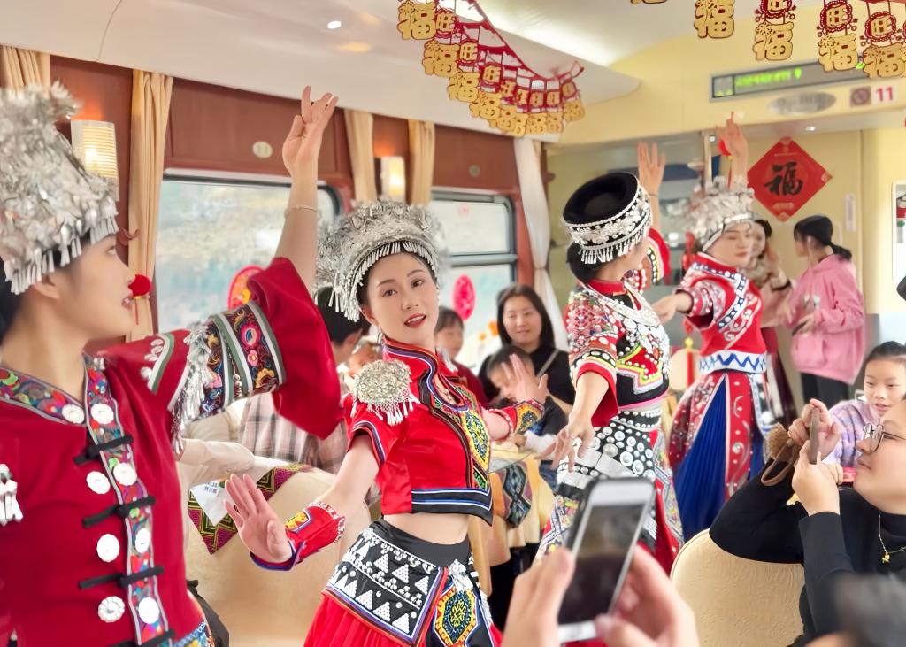 不到10分钟,餐车上的“观众席”便满座了,席间有“三代同堂”的家庭游客,也有结伴回乡的工友、同学,男女老少的脸上都洋溢着笑容。“我们的‘春晚’,像往年一样反响热烈!”列车员、“春晚”主持人刘欣自豪地说。