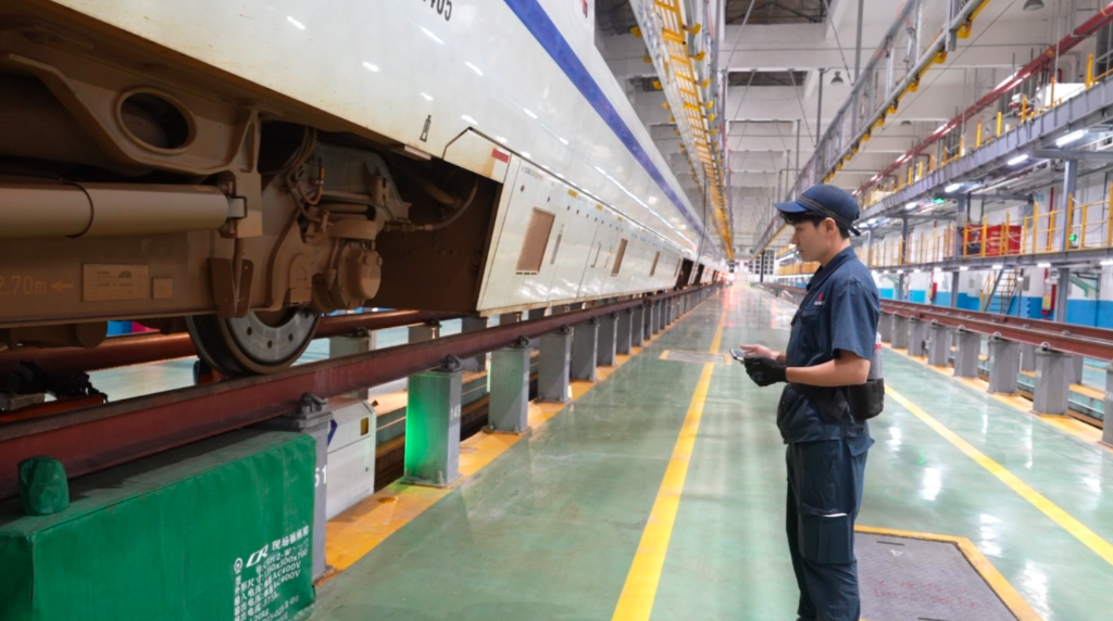 地沟检测机器人配合机械师对动车组实施精准检测。(黎多江 摄)