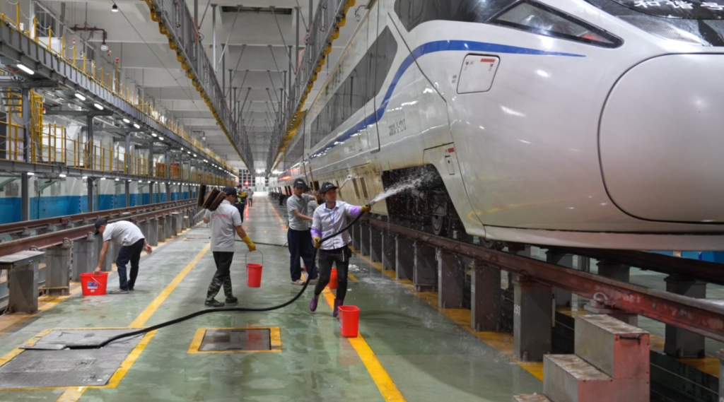 工作人员抓紧时间清洗动车组。(黎多江 摄)